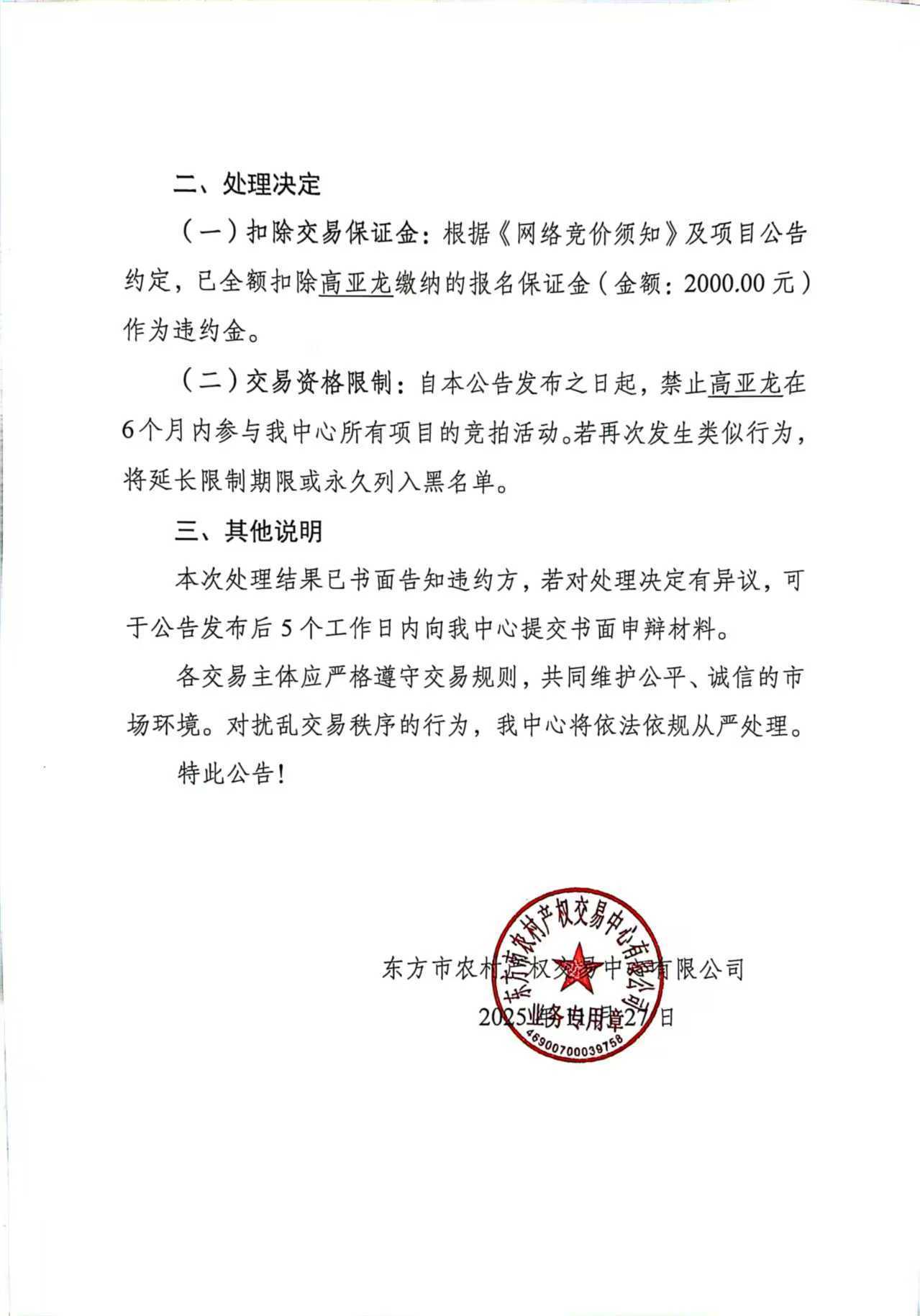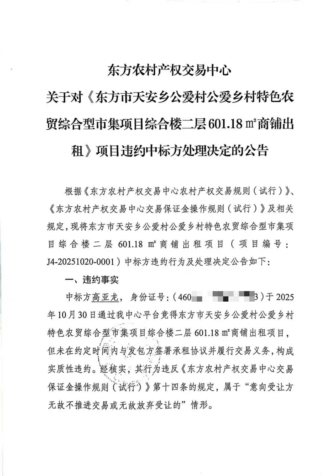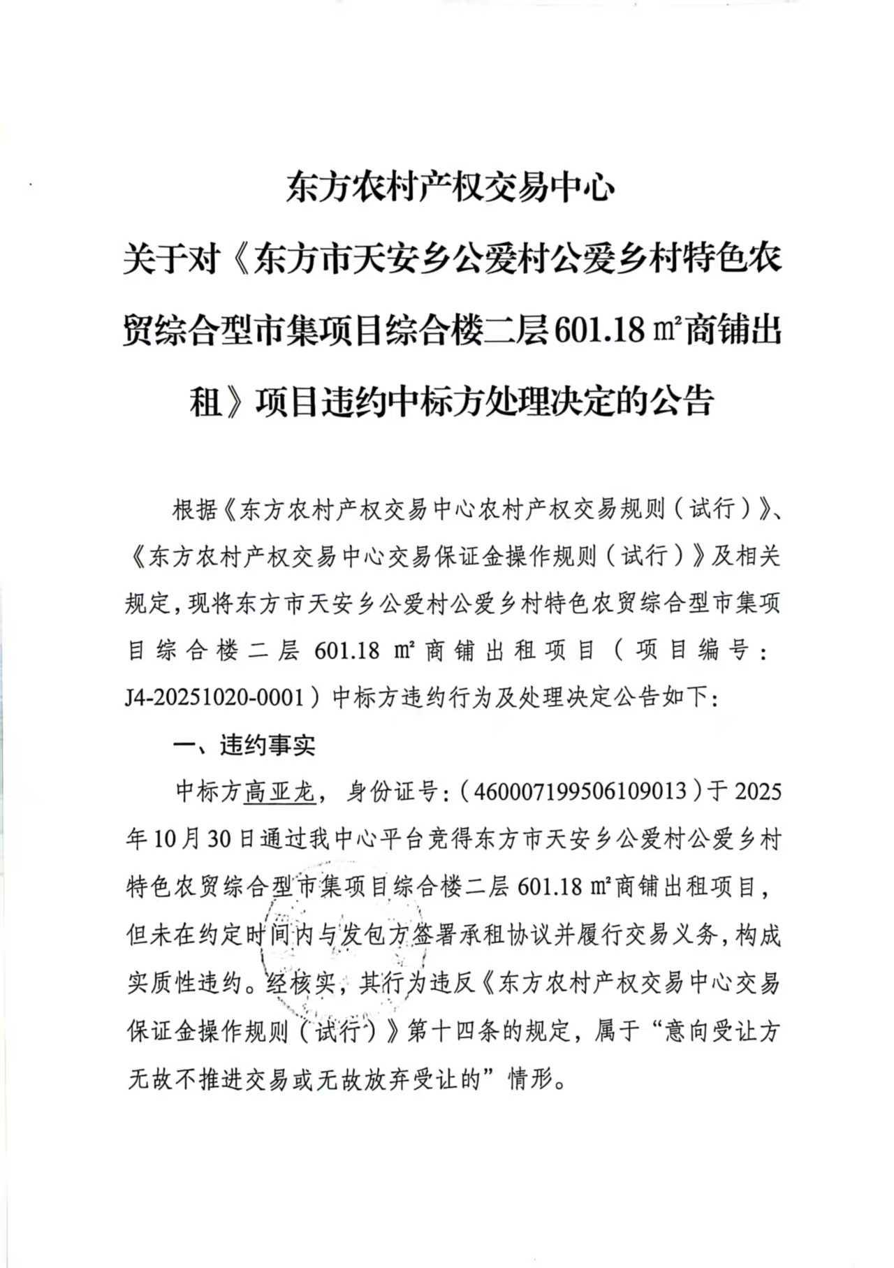 东方农村产权交易中心 关于对《东方市天安乡公爱村公爱乡村特色农贸综合型市集项目综合楼二层601.18㎡商铺出租》项目违约中标方处理决定的公告