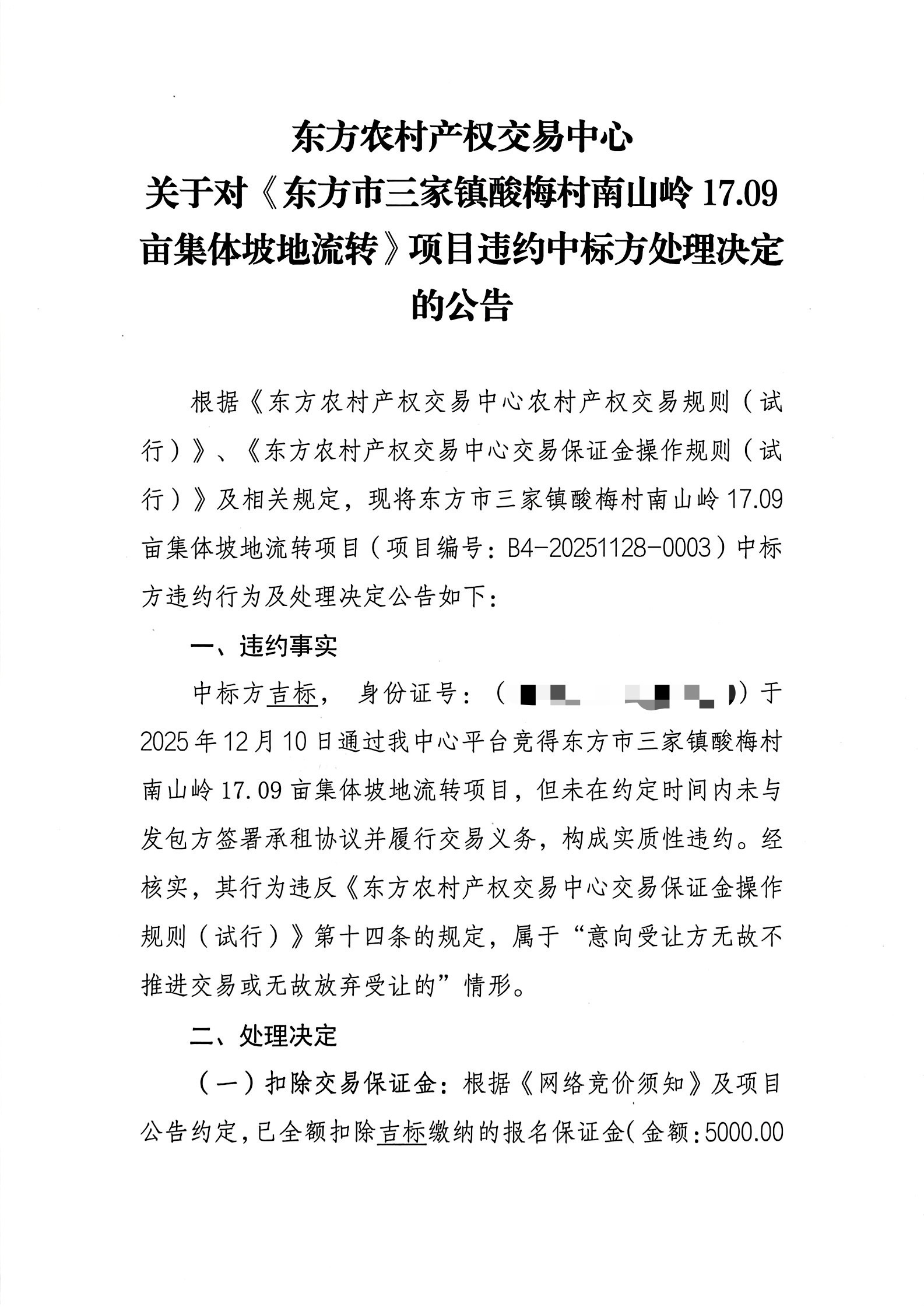 东方农村产权交易中心 关于对《东方市三家镇酸梅村南山岭17.09亩集体坡地流转》项目违约中标方处理决定的公告