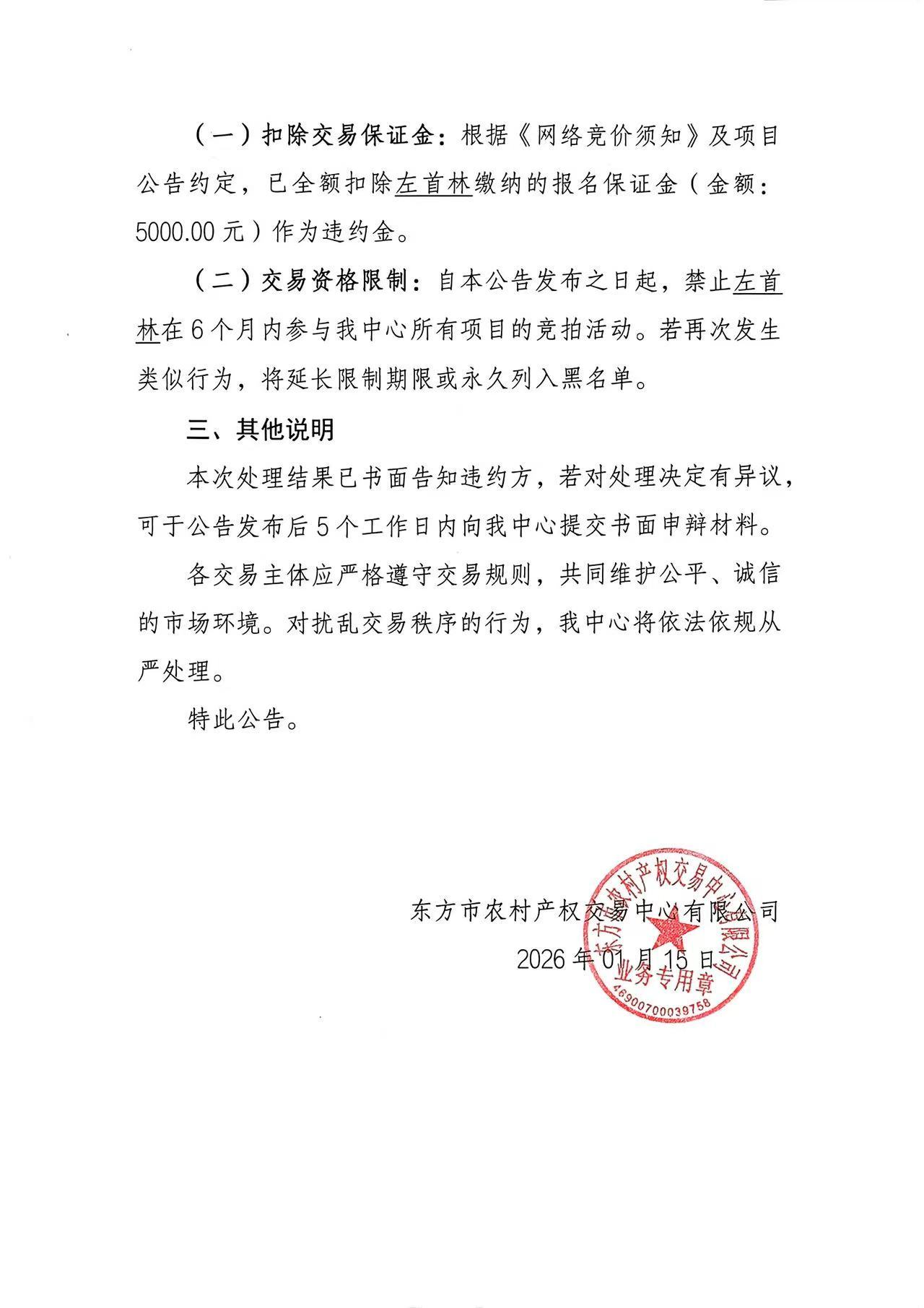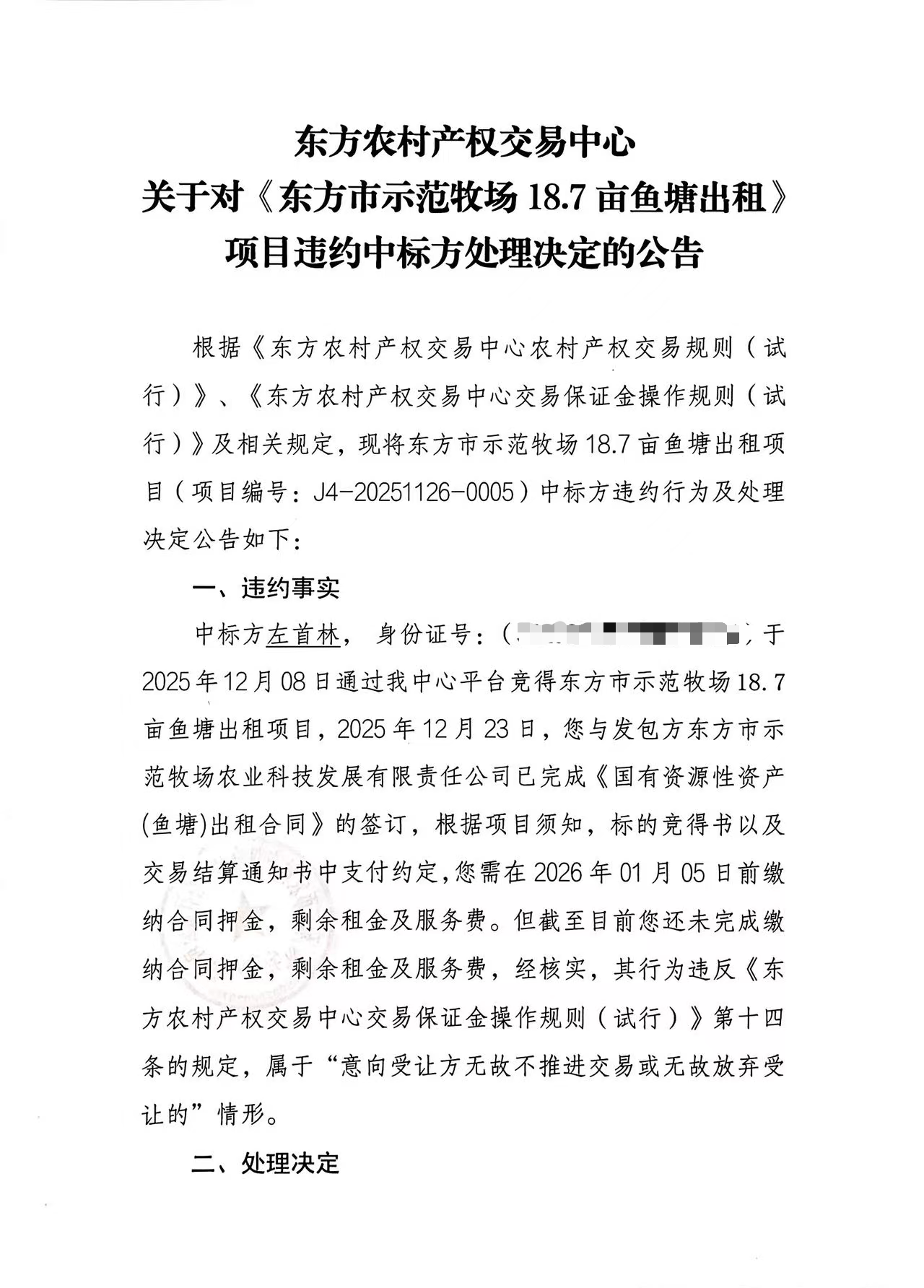 东方农村产权交易中心 关于对《东方市示范牧场18.7亩鱼塘出租》项目违约中标方处理决定的公告
