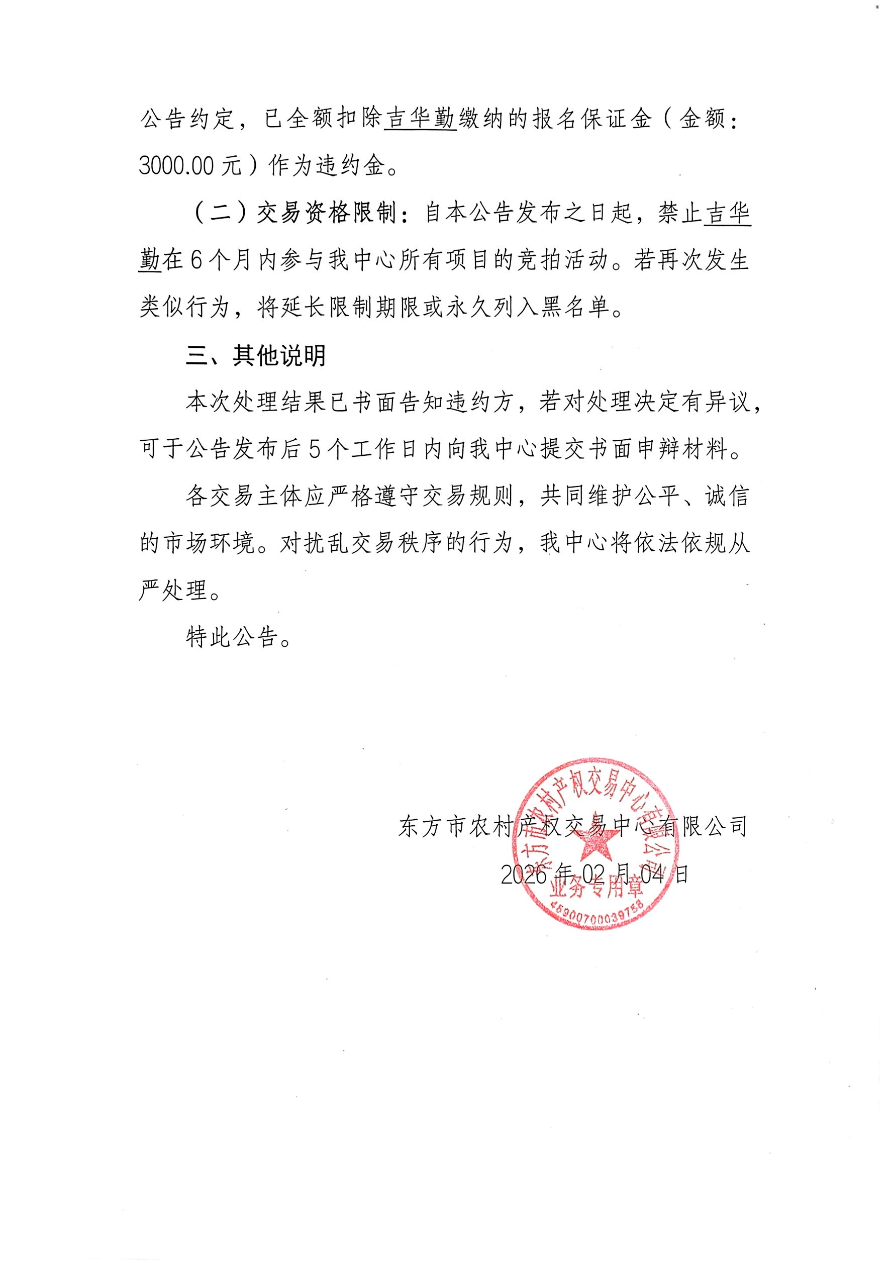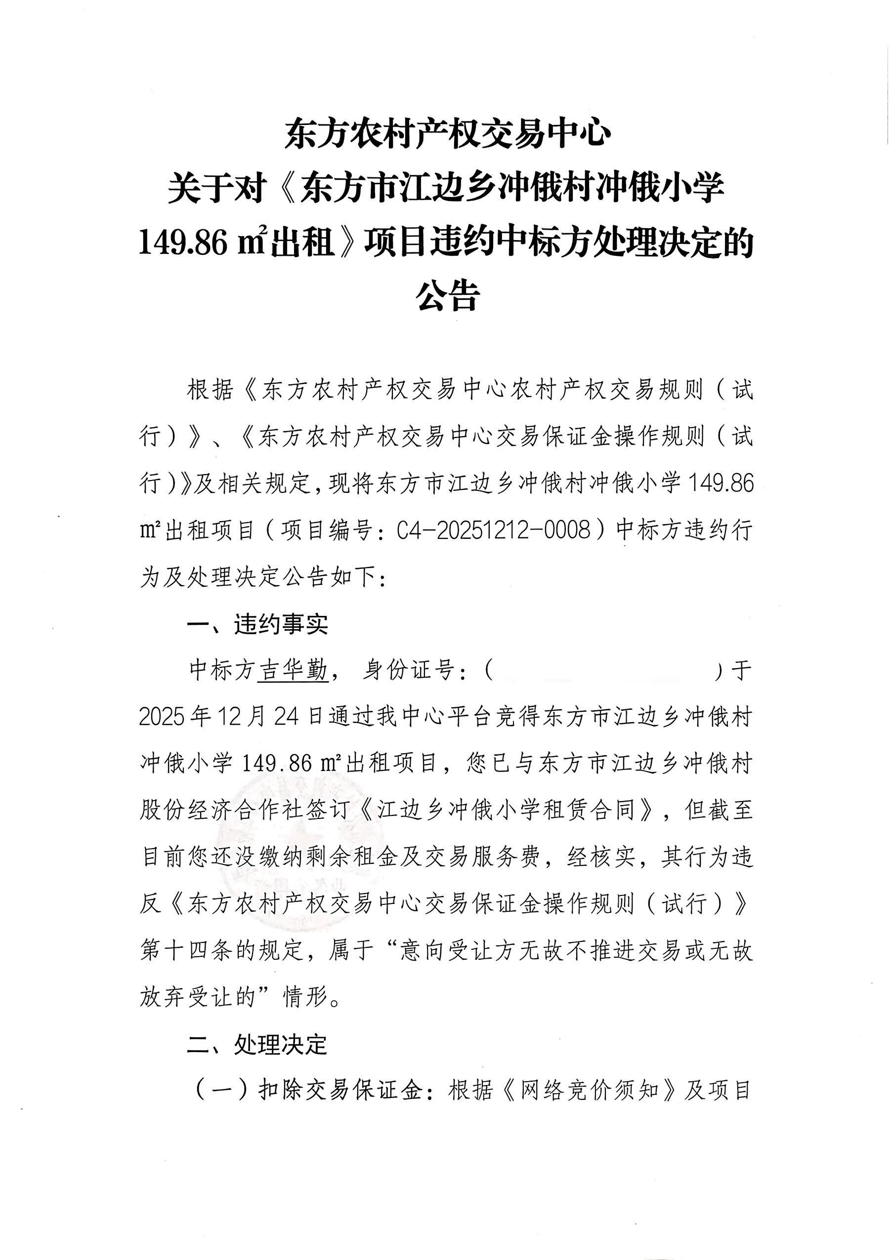 东方农村产权交易中心 关于对《东方市江边乡冲俄村冲俄小学149.86㎡出租》项目违约中标方处理决定的公告